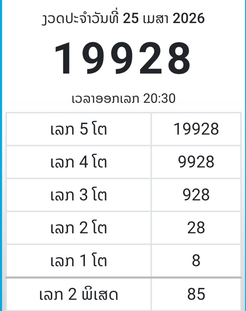 เมษายน 25, 2026ผลการออกรางวัล หวยลาวสามัคคี ( ຫວຍລາວສາມັກຄີ ) งวดวันที่ 25 เม.ย. 69 เวลา 20.30 น.