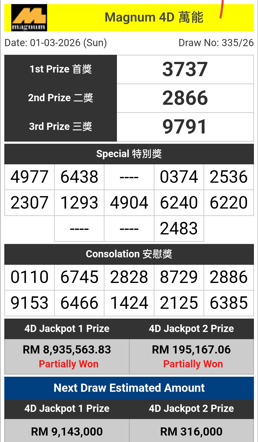 ผลการออกรางวัล หวยมาเลย์ ( Magnum 4D 万能万字 ) งวด วัน